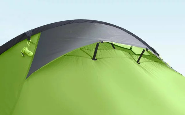 Tunnelzelt mit 3 doppelten Eingängen (zusätzliche Moskitogaze-Türen), welche als Sonnendach ausstellbar sind. Gegenüberliegende Seiteneingänge verfügen über zusätzliche, verschließbare Lüftungsfenster. Die fest eingenähte Bodenplane sorgt für zusätzlichen Komfort. Schlafkabine mit Moskitogaze-Tür (von innen blickdicht verschließbar) und praktischen Organizern. Zeltlampenaufhängung im Dachbereich. Doppelt abgedeckte Reißverschlüsse.