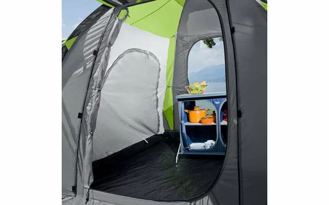 Zwei gegenüberliegende Eingänge (als Sonnendach ausstellbar) mit zusätzlichem Fenster an der Außenhaut (50 % Moskitogaze / 50 % Folie). Beide Eingänge verfügen über eine Moskitogaze-Tür um für beste Ventilation zu sorgen. Doppelt abgedeckte Reißverschlüsse an den Eingängen. Seitliche Dauerbelüftungen inkl. Windfang. Per Reißverschluss komplett verschließ- oder aufrollbar. Fest eingenähter Zeltboden für mehr Komfort. Gegenüberliegende Schlafkabinen (einzeln herausnehmbar) inkl. Moskitogaze-Tür (von innen blickdicht verschließbar). Zeltlampenaufhängung in der Mitte des Zeltes. Die komfortable Stehhöhe beträgt 195 cm.