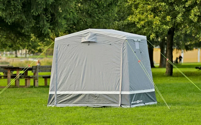 Vielseitig einsetzbares, freistehendes Gerätezelt mit Giebeldach aus beidseitig beschichtetem Polyestergewebe mit bandversiegelten Nähten. Ausgezeichnete Belüftungsmöglichkeiten dank einem großen Fenster in der Rückwand und 2 kleineren Fenstern in den Seitenwänden. Der eingenähte Zeltboden garantiert eine sichere Aufbewahrung des gelagerten Equipments. Große Eingangstür, die nach oben gerollt- und zudem ausgestellt werden kann. Inklusive 2 Aufstellstangen, Montagematerial und Tragetasche.