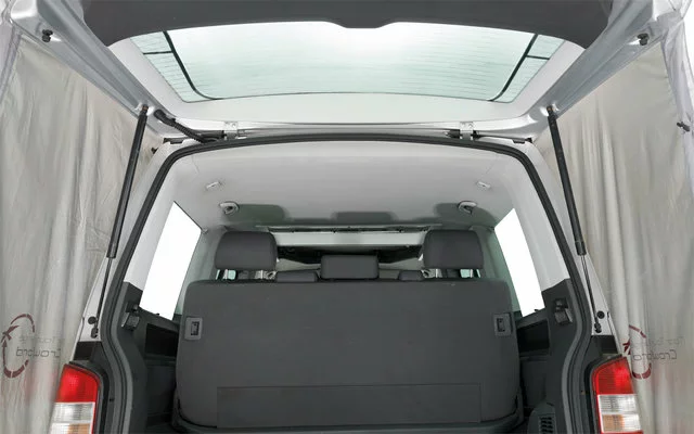 Die vielseitige Konstruktion des Heck-Vorzelts Easy Camp Crowford schafft flexibel nutzbaren Raum für VW-Bus Camper. Es ist die ideale Wahl für den VW T5 bzw. T6 California. Mit zwei Abspannleinen wird es sich sicher an der Heckklappe befestigt. Darüber hinaus verfügt es über eine Tür mit angenehmer Durchgangshöhe, die zum Schutz vor Sonne und Regen hochgeklappt werden kann. Entworfen für das Heck eines VW California T5/T6 Stahlstangen für das Vordach über der Vordertür enthalten. Verdeckte Lüftung auf der Vorderseite Fenster mit aufrollbaren Vorhängen an beiden Seiten. Ausgestattet mit Befestigungshaken mit Klappen zum Schutz der Kanten am Heck.