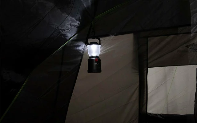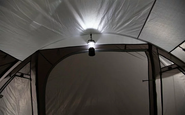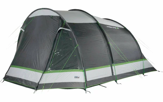 Kompaktes Tunnelzelt mit eingenähtem Boden hält Feuchtigkeit, Schmutz und Krabbeltiere aus dem Zelt. Der Wohnraum in 1,9m Stehhöhe bietet Platz für Camping Ausrüstung. 2 Moskitonetz-Eingänge belüften den Wohnbereich und halten Insekten aus dem Zelt. 3 Klarsichtfolienfenster bringen Licht in den Wohnraum, Gardinen schützen vor neugierigen Blicken. Das Dach hat eine Aluminium- Beschichtung und ist Hitze reflektierend. 2 Dauerventilationen belüften das Zelt auch an regnerischen Tagen und sollten immer geöffnet sein. Die High Peak 3- Stufen “Dual Flow“ Ventilation“ im Schlafbereich passt sich jeder Wettersituation optimal an.