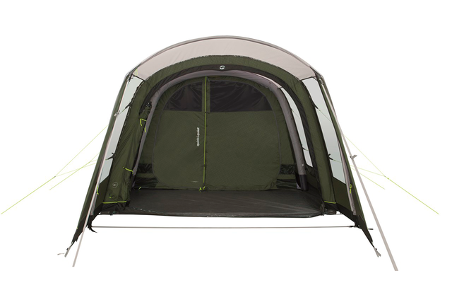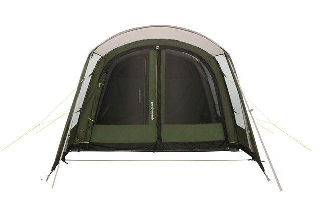 Dank der großen Fenster und der guten Belüftung genießen Sie ein lichtdurchflutetes, luftiges Zelt. Ein gemütliches Vordach mit großen Seitenfenstern über der Vorderseite bietet einen Platz im Freien, an dem Sie sich entspannen und Ihren Urlaub genießen können. Die vorderen Paneele auf beiden Seiten des Vordachs können abgehängt oder weggerollt werden, um einen flexiblen Schutz zu bieten.