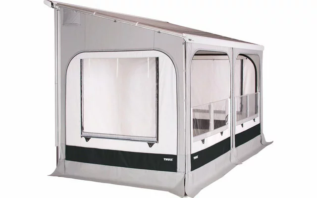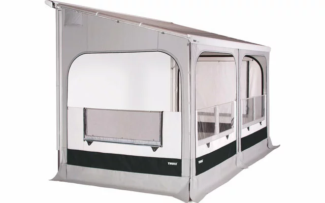 Die Vorderwand ist serienmäßig mit vier verschiedenen Eingangsvarianten ausgeführt. Die Türöffnung kann in jedem Frontteil rechts oder links gestaltet werden. Große Fensterflächen lassen viel Licht herein und vermitteln ein richtiges Draußengefühl. Die vier Fenstereinsätze in Front- und Seitenteilen können mit den Reißverschlüssen vollständig herausgenommen werden. Integrierte Kederseele an die Vorderwand der Zelt für optionales Zubehör (Thule Sun Blocker G2 Vorderwand). Die seitlichen Fensterklappen können vollständig geöffnet werden, bleiben aber mit einem Moskitonetz abgedeckt. Dauerbelüftungsöffnung auf beiden Seiten. Vollständig modulare Konstruktion. Jedes Teil kann auch einzeln verwendet werden