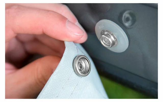 Ein Klemmprofil sorgt für die Verbindung der Seitenwand mit dem Markisentuch. Beide Seitenteile sind mit einem ReißverschIuss für optimale Verbindung zur Vorderwand ausgestattet. Die Profile mit doppelten Gummilippen stellen eine perfekte Abdichtung zwischen Fahrzeugwand und Zeltwände her und sorgen für optimale Spannung. Die Diagonalstützen zwischen Mast- und Klemmprofil bieten ausgezeichnete Stabilität.