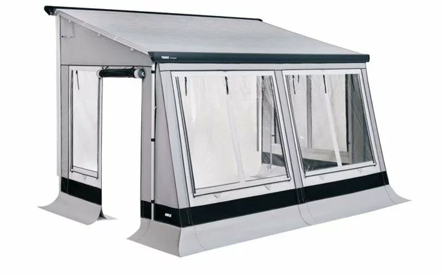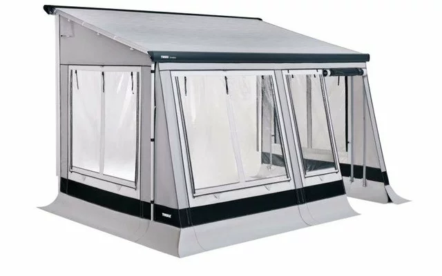- Weiteres Zubehör kann an der Keder-Schiene an der Vorderwand des Zelts angebracht werden